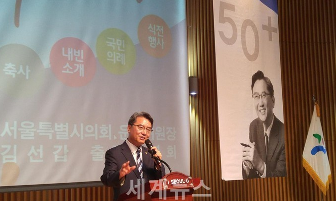 ▲ 김선갑 서울시의회 운영위원장이 29일 오후5시 서울시청 8층 다목적홀에서 열린 중장년층의 행복지침서 ‘50플러스세대, 인생 제2막을 사는 법’ 출판기념회에서 인사말을 하고 있다. © 세계뉴스 |
