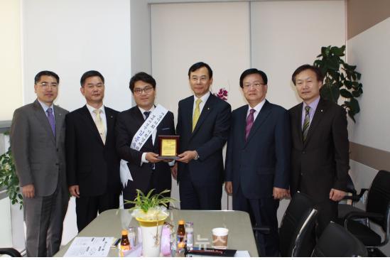 ▲ 김종욱 서울시의원(왼쪽 세번째)이 서울신용보증재단 강진섭 이사장(오른쪽 세번째)으로부터 명예지점장 위촉패를 받고 있다. © 세계뉴스 |
