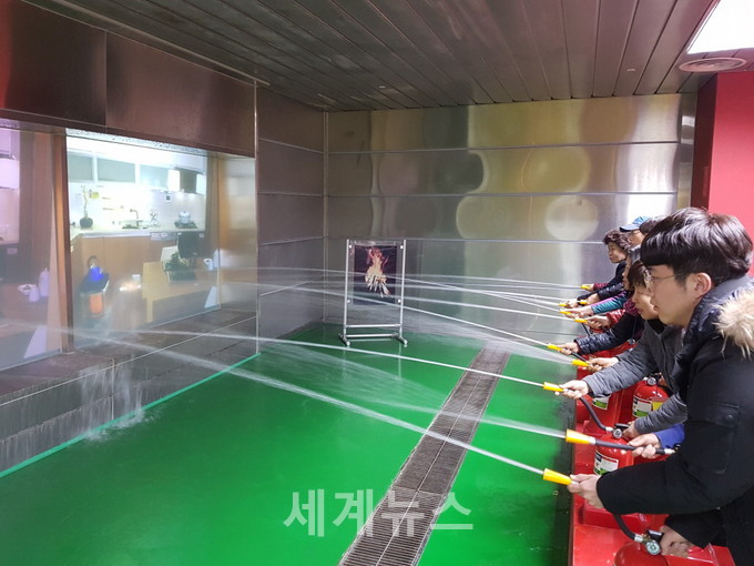 ▲ 도봉구가 재난안전 체험교육을 실시하고 있는 가운데 교육생들이 소화기 분사 실습을 하고 있다. © 세계뉴스 |