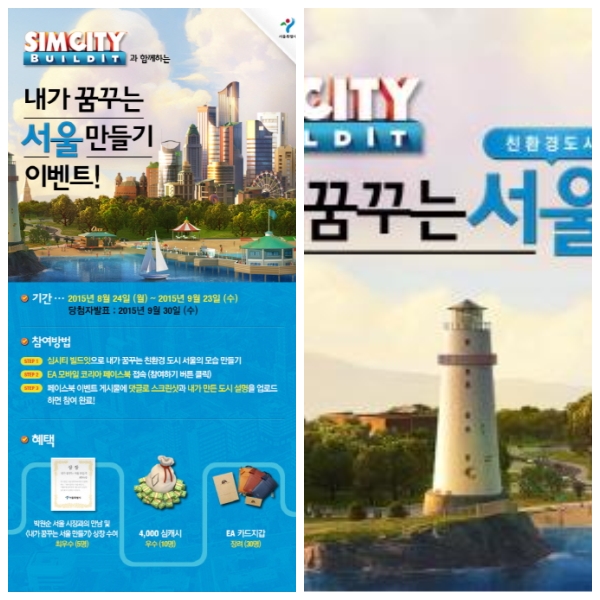 서울시는 글로벌 게임 회사인 EA코리아와 함께 ‘내가 꿈꾸는 서울 만들기’ 이벤트를 진행하고 있다. 이번 이벤트는 EA코리아의 인기 모바일 게임인 ‘심시티 빌드잇’에서 자신이 꿈꾸는 친환경 도시 서울의 모습을 직접 만들어보고 많은 사람들과 함께 공유할 수 있는 특별한 경험을 제공하기 위해 마련되었다.