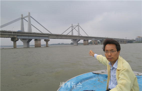 ▲ 3일 행주대교 앞 현장을 찾은 김광수 서울시의원이 멈춰서버린 서울함을 손으로 가르키고 있다. © 세계뉴스 |