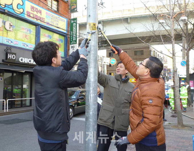 ▲ 불법광고 부착물을 떼어내고 있는 직원들 © 세계뉴스 |