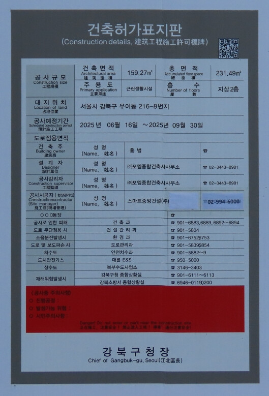 건축허가표지판에는 건축주가 홍범 씨로 기재돼 있다. 홍 씨는 예닮장로교회 담임목사 홍ㅇㅇ 씨의 아들로, 공개 자료에 따르면 홍 목사는 강북구청장 이순희 배우자로 알려졌다.