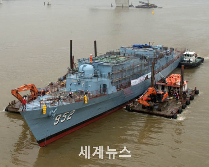 [세계뉴스] 전승원 기자 = 24일 오전 행주대교와 방화대교 사이에 모래톱에 발이 묶여있던 해군 퇴역함정 서울함(1900t급)을 서울시 공무원들이 예인선을 이용해 예인하고 있다.