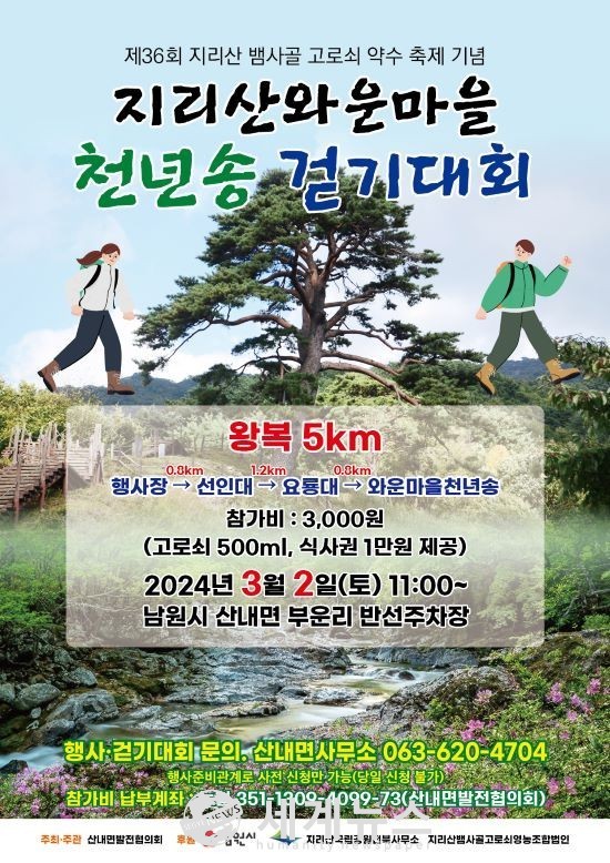 또한 지리산 천년송 걷기대회는 소액의 참가비를 내면 고로쇠 1병 (500㎖) 제공, 산내면 관내 식당을 무료로 이용할 수 있는 식사권을 제공한다.