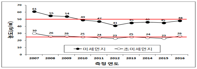 ▲ 연도별 미세먼지 및 초미세먼지 현황(환경부 기준 포함) © 세계뉴스 |
