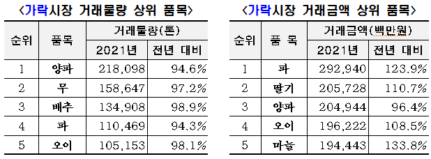 가락시장 거래물량 상위 5개 품목은 양파, 무, 배추, 파, 오이 순이며, 거래금액 상위 5개 품목은 파, 딸기, 양파, 오이, 마늘 순으로 나타났다.