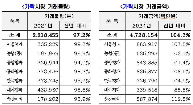 2021년 가락시장 청과부류 거래물량은 222만톤으로 전년 대비 2.8% 감소하였고, 거래금액은 4조 7,282억원으로 전년 대비 4.3% 증가한 것으로 나타났다. 과일류는 전년 대비 거래물량이 3.6% 감소한 반면, 거래금액은 7.5% 증가했다. 채소류는 전년 대비 거래물량이 2.6% 감소한 반면, 거래금액은 3.5% 증가했다.