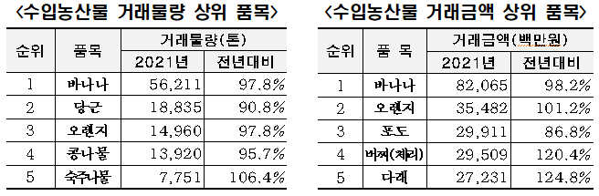 수입 농산물은 총 18만6천톤으로 전체 거래물량의 8.4% 수준으로 나타났다. 수입 과일류 거래물량은 전년 수준인 10만6천톤으로 바나나, 오렌지, 포도, 파인애플 등 주요 수입과일이 감소했다. 수입 채소류 거래물량은 전년 대비 1.8% 감소한 8만톤으로 당근, 호박, 브로콜리 등이 감소했다.