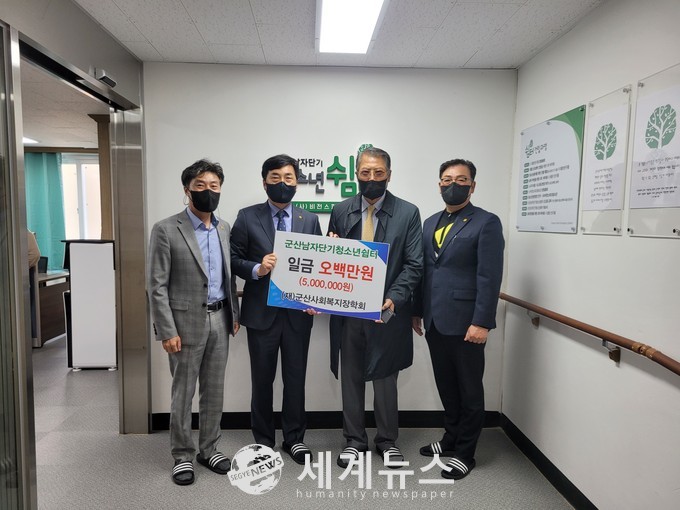 [세계뉴스 윤준필 기자] (재)군산사회복지장학회 장학회(이사장 김기봉)에서는 코로나19로 힘든 여건 속에서도 5일 군산남자청소년단기쉼터를 찾아 운영지원비 500만 원을 전달하였다고 밝혔다.