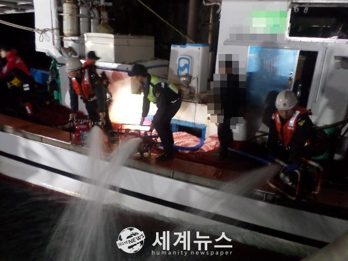 ▲ 군산해경이 횡경도 인근 해상에서 침수 중인 어선 A호에서 배수 작업을 실시하고 있는 사진 |