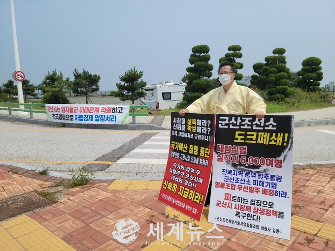 [세계뉴스 윤준필 기자] 군산조선해양기술사업협동조합 김광중 이사장이 신시도 한국농어촌공사 새만금 33센터 사거리에서 피켓을 들고 1인 시위에 나섰다.
