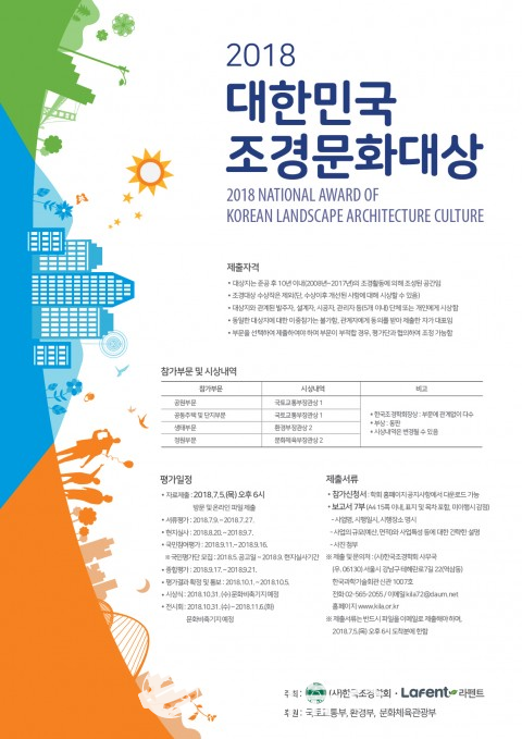 ‘2018 조경문화대상’의 시상식 및 전시회는 10월 31일부터 11월 6일까지 마포 문화비축기지에서 열리는 ‘대한민국 조경문화제’ 기간에 있을 예정이다.