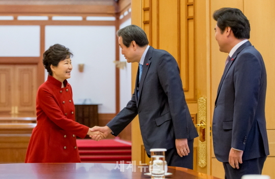 ▲ 박근혜 대통령이 7일 오후 청와대에서 새누리당 지도부와 회동에 앞서 악수를 나누고 있다. © 세계뉴스 |