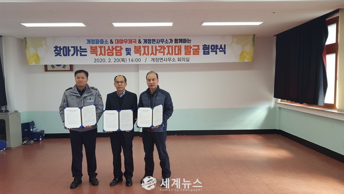 [세계뉴스 윤준필 기자] 군산시 개정면사무소(면장 이학천)는 20일 개정면사무소 대회의실에서 개정파출소(소장 이권교), 대야우체국(국장 김수정)과 복지사각 발굴 업무 협약을 체결했다.
