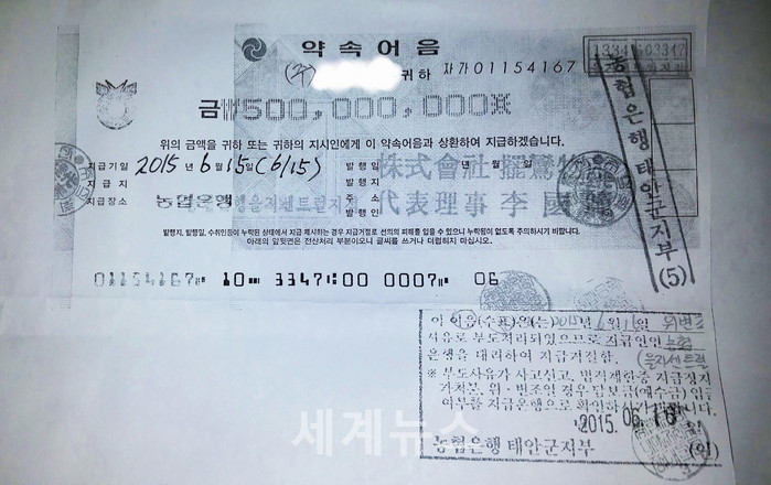 ▲ 6월 16일 농협은행 을지로센트럴지점에서 발급된 5억원권 약속어음이 최종 위변조된 가짜로 판명됐다. 앞서 6월 10일 일련번호가 같은 어음이 입금 되었다. 또한 (주)파란물산의 발행사 어음은 5월 26일 최종부도처리된 것으로 드러났다. © 세계뉴스 |