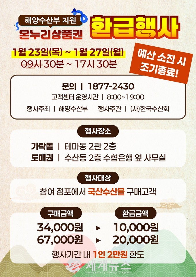 국내산 수산물 소비촉진을 위해 해양수산부 및 한국수산회에서 주관하는 행사로 가락시장 내 497개 점포에서 3만4천원 이상 구매시 1만원권, 6만7천원 이상 구매시 2만원권의 온누리 상품권을 받을 수 있다.