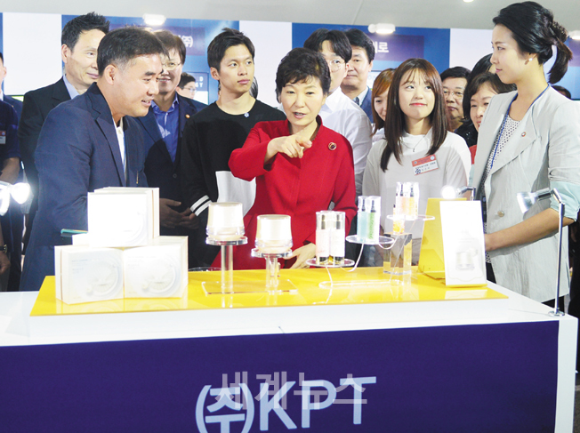 ▲ 박근혜 대통령이 27일 오후 대전 한국과학기술원(KAIST)에서 열린 창조경제혁신센터 페스티벌 개막식에 참석, 창조경제 성과물 전시 부스를 찾아 KPT 이재욱 대표로부터 백삼콜라겐 진주환의 설명을 듣고 있다. © 세계뉴스 |