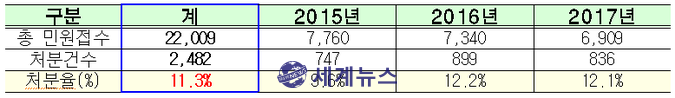 최근 3년간 민원신고 건에 대한 자치구 처분율 자체는 점차 높아지고 있는 추세이나 자치구 간 편차가 있었다. 또 처분이 이뤄지더라도 과태료만 부과하고 자격정지·취소의 신분상 처분 대신 주의·지도교육 수준에 머물렀다.