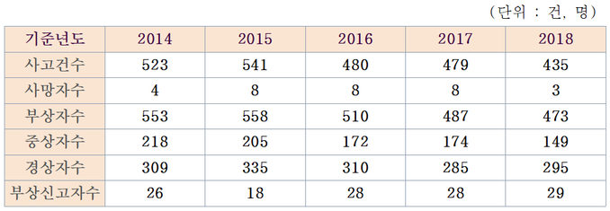 도로교통공단에 따르면 전국 어린이 보호구역 내 교통사고 건수는 지난 2014년 523건에서 2018년 435건, 사망자수는 2014년 4명에서 2018년 3명, 부상자수는 2014년 553명에서 2018년 473명으로 근절되지 않고 계속적으로 발생하고 있다.