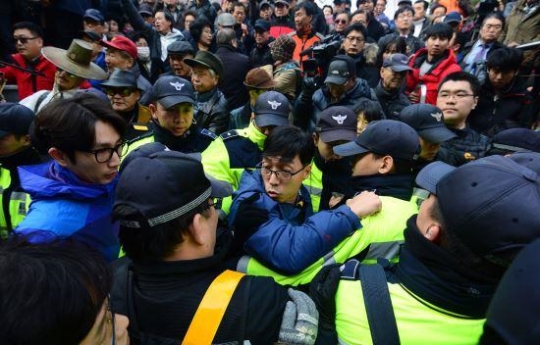 ▲ 조계사 내 경찰과 민주노총이 대치하면서 몸싸움을 벌이고 있다. © 세계뉴스 |
