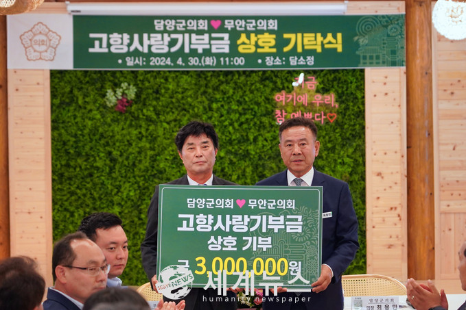 [세계뉴스 양경희 기자] 담양군의회(의장 최용만)와 무안군의회(의장 김경현)는 지난 30일, 고향사랑기부제 활성화와 지역 간 상생발전을 위해 담양읍 담소정에서 고향사랑기부금을 상호 기부하는 기탁식을 가졌다.