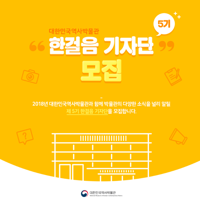 올해 ‘한걸음 기자단’은 대한민국 근현대사에 관심이 많고 박물관 취재가 가능한 대학(원)생 및 일반인이면 누구나 지원 가능하다. 선발된 ‘한걸음 기자단 5기’는 2월 말 발대식을 시작으로 총 10개월간 박물관이 개최하는 특별전, 문화 공연 등 주요 행사의 현장 취재와 대한민국 근현대사와 관련한 콘텐츠를 전달할 예정이다.