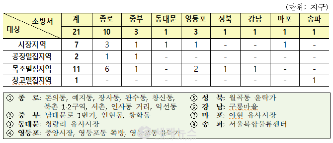 ▲ 서울시 화재예방강화지구 21개 지역(총 2,822동, 966,481.04㎡) 현황. |