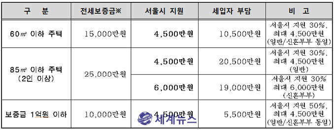 [세계뉴스] 정서영 기자 = 서울시가 최근 주택임대시장의 전월세 가격상승으로 높은 전세 비용에 어려움을 겪고 있는 무주택 서민의 주거비 부담을 덜어주기 위해 전월세보증금의 30%를 지원하는 ‘보증금지원형 장기안심주택’을 3차로 500호 공급한다고 밝혔다.
