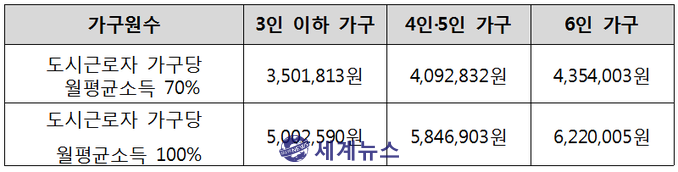 도시근로자 가구당 월평균 소득 70%는 4인·5인 가구의 경우 월 평균 총 수입이 409만 원 수준이다.