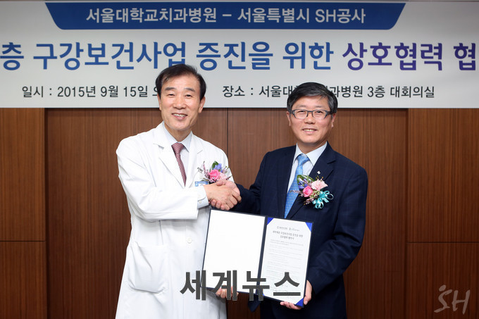 [서울=세계뉴스] 전승원 기자 = 서울시 SH공사 변창흠 사장은 15일 오후2시 서울대학교치과병원에서 류인철 서울대학교치과병원장과 서울시 취약계층을 대상으로 무료 치과치료 등 구강보건 증진사업를 펼치기 위한 양해각서(MOU)를 체결했다.