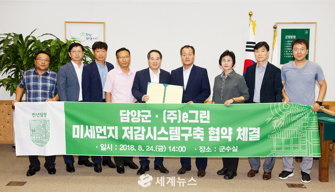 ▲ 24일 (주)e그린과 담양군이 '미세먼지 저감시스템 구축 사업' 업무협약을 체결했다. 최형식 담양군수(외쪽 가운데)가 협약서에 서명하고 기념쵤영을 하고 있는 모습. |