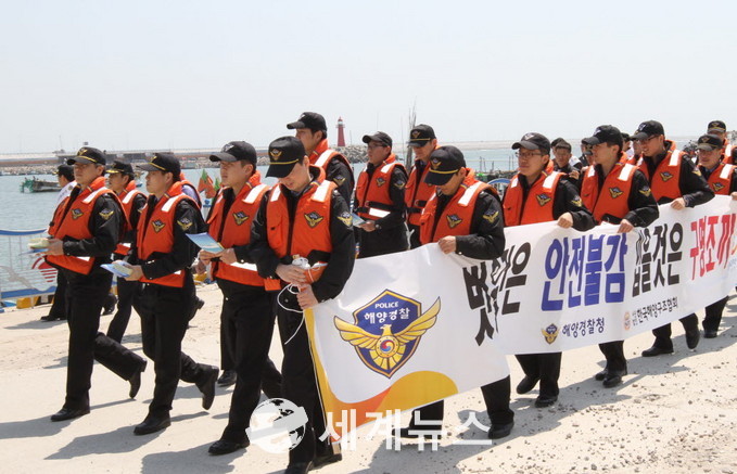 [세계뉴스] 한차수 기자 = 군산해경이 정부혁신의 일환으로 쉽게 국민 속으로 다가가고 바다가족과 소통하기 위해 구명조끼 착용 범국민 생활화에 나섰다.