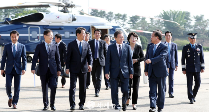 ▲ 문재인 대통령이 21일 러시아를 국빈방문으로 출국에 앞서 나란히 이동하면서 김부겸 장관과 대화를 나누고 있다. |