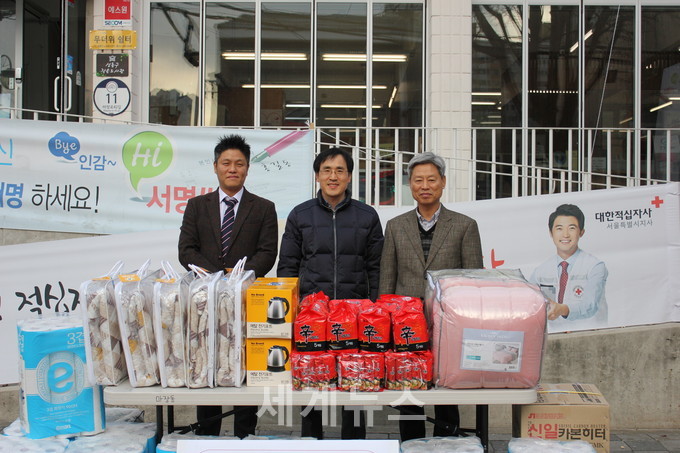 ▲ 김종수(오른쪽) 성동구도시관리공단 이사장과 엔터식스는 관내 독거노인과 지역아동센터에 온열기, 전기장판, 전기요, 이불 등을 전달했다. © 세계뉴스 |