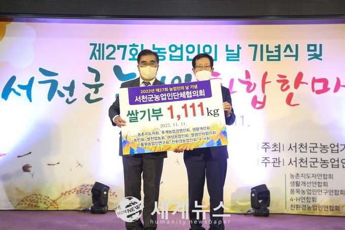 [세계뉴스 유진웅 기자] 서천군농업인단체협의회(회장 이문복)가 지난 11일 농업인의 날을 기념해 서천군 사회복지시설에 쌀 1111kg을 기부했다.