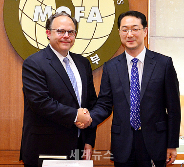 ▲ 27일 오후 서울 종로구 외교부 청사를 방문한 시드니 사일러 미국 국무부 6자회담 특사와 김건 외교부 북핵외교기획단장이 악수를 하고 있다. © 세계뉴스 |