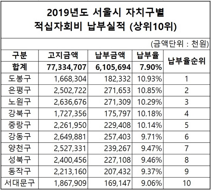 2019년에는 도봉구(10.93%), 은평구(10.85%), 노원구(10.29%), 강북구(10.18%), 중랑구(10.14%), 강동구(9.71%), 양천구(9.47%), 성북구(9.46%), 동작구(9.37%), 서대문구(9.06%)가 납부율 상위 10위 안에 드는 자치구로 기록됐다.