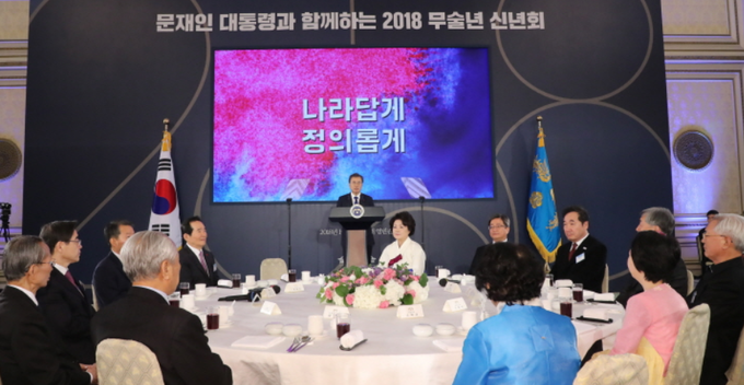 ▲ 2일 문재인 대통령과 함께하는 2018 무술년 신년회에서 문 대통령이 인사말을 하고 있다. © 세계뉴스 |