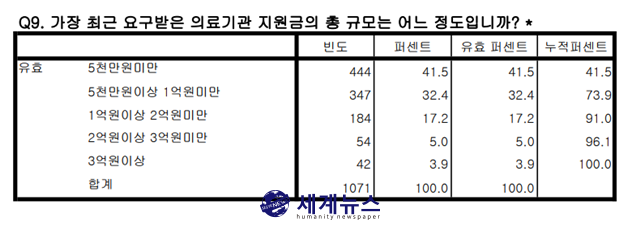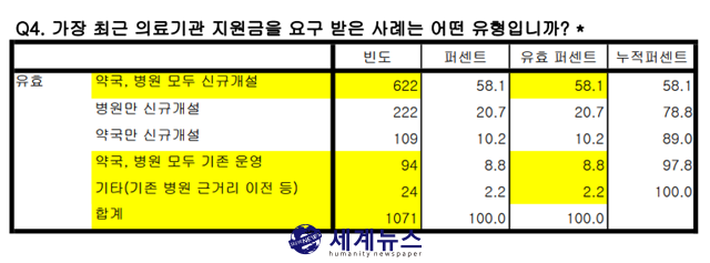 하지만 최근 대한약사회에서 7일간(5월17일 ~ 23일) 대한약사회 회원 중 개설약사 및 근무 약사 상대로 설문조사 한 결과 지원금 요구받은 경험이 58.7% 로 나타났다. 또한 ‘지원금 요구 알선한 사람은 누구입니까?’ 의 질문에 브로커 60.4%, 의사 51.1%, 부동산중개업자 17.6% 였다. 지원금 종류로는 인테리어비용 56.2%, 특별한 명목 없음 42.6%, 기계설비 물품비용 13.8% 등의 명목이었다. 더욱이 의료기관에선 지원금을 최대 3억 이상까지 요구한 경우도 있었다. 무엇보다 이들 부당거래는 약국과 의료기관 모두 신규개설시에 58.1%로 가장 많이 발생하는 것으로 나타났다.