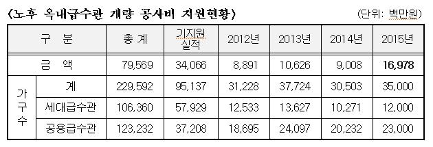 노후 옥내급수관 개량비 지원 사업은 1994년 4월 이전에 건축된 건축물의 경우 급수관으로 녹이 잘 스는 아연도강관이 사용되어 관 노후화로 인해 녹물이 출수됨에 따라 수돗물에 대한 불신을 초래하고 있어 이를 해소하는 차원에서 2007년부터 노후 옥내급수관 개량 시 공사비의 일부 또는 전부를 지원하는 것으로 2015년 말 기준 지원 금액은 795억 69백만원에 달할 것으로 전망되고 있다.