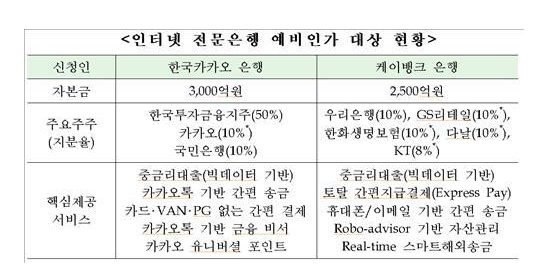 이날 금융위는 예비인가와 함께 동일인(비금융주력자)이 주식보유한도(4%)를 초과한 카카오은행의 카카오와 케이뱅크의 KT, GS리테일, 다날, 한화생명, KG이니시스 등의 보유한도 초과 신청을 승인했다.