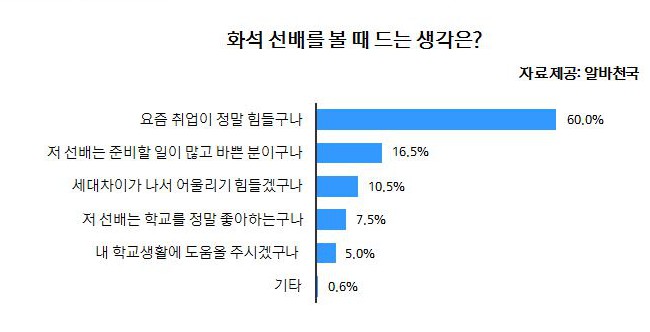 이어 ‘저 선배는 준비할 일이 많고 바쁜 분이구나’(16.5%), ‘세대차이 나서 어울리기 힘들겠구나’(10.5%)가 나란히 2, 3위에 올랐으며, ‘저 선배는 학교를 정말 좋아하는구나’(7.5%)와 ‘내 학교생활에 도움을 주시겠구나’(5%) 라고 생각하는 비율은 상대적으로 높지 않은 것으로 나타났다.