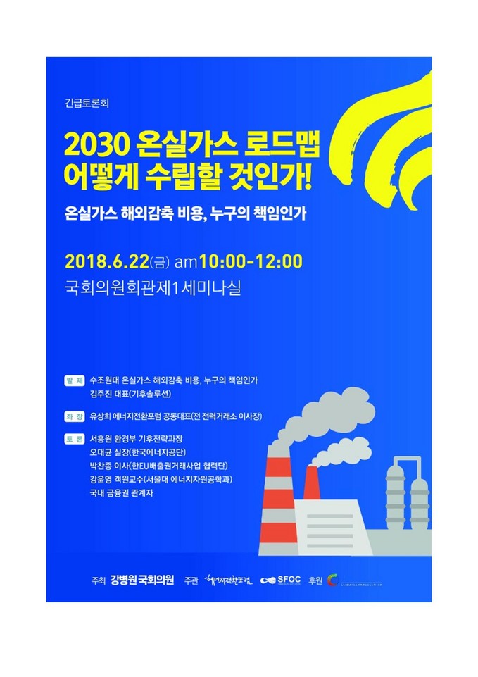 2030년까지 온실가스 배출량 전망치(BAU) 대비 37% 수준을 감축하는 것이 파리기후협정에 제출한 기존 2030 온실가스 감축 로드맵의 목표치이다. 이 중 해외 감축량 11.3%의 비율 조정과 비용 감당의 책임 소지를 이번 토론회에서 논의하게 된다. 국회예산정책처의 보고서에 따르면 1) 2015∼16년 국내 배출권 톤당 평균 거래가인 16,294원과 2) 2021∼2030 EU배출권거래제 예상 톤당 평균 배출권 거래가인 25 유로를 바탕으로 8.8∼17.6조원의 비용이 추산되었다.