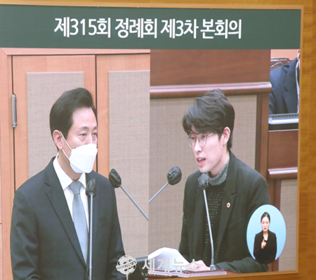 ▲ 임규호 서울시의원이 오세훈 서울시장을 상대로 5분자유발언을 통해 서울시가 말한 안전관리 매뉴얼이 없다는 건 사실이 아니라고 지적했다. |