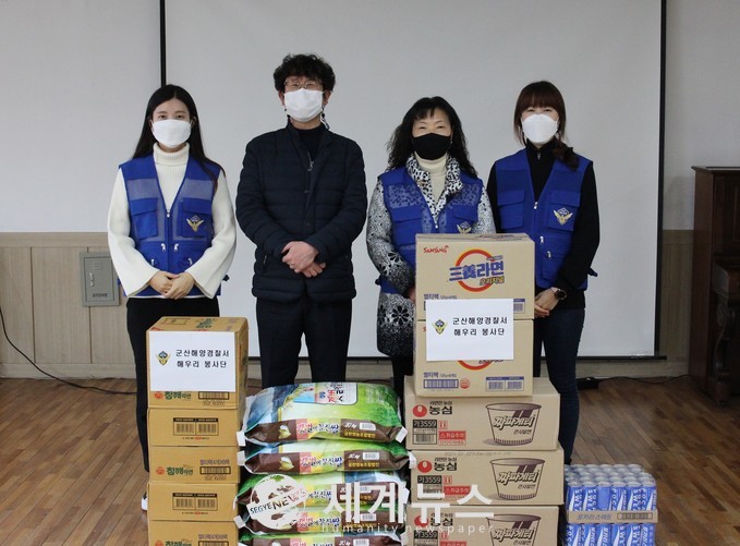 24일 군산해양경찰서는 직원들로 구성된 ‘해우리 봉사단’에서 새해 봄기운을 담아 장애 아동들이 있는 전북 군산시 월명동 소재의 산돌학교를 방문해 쌀과 라면 등 생필품을 전달했다고 밝혔다.