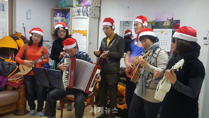 경로당 어르신들은 산타클로스 모자를 쓴 김 의원과 봉사단원을 반갑게 맞아 주었다. 먼저 아코디언(전을수)과 우쿨렐레(김광수)로 아리랑을 비롯한 가요를 연주 하는 등 하모니카(김갑수)로 동요를 들려주었다. 어르신들은 연주에 맞추어 노래를 하며 즐거운 시간을 보냈다.