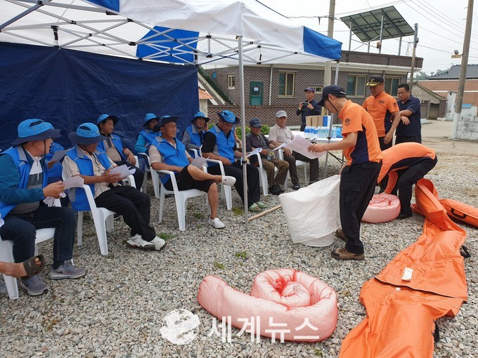 ▲ 부안해양경찰서는 27일 고창군 해리면 동호어촌계를 국민방제대로 신규 지정하고 발대식을 가졌다. 동호어촌계 주민들을 대상으로 방제교육을 실시하고 있다. |