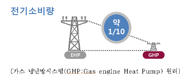 ▲ 가스 냉난방시스템(GHP)의 전기소비량은 전기 냉난방시스템(EHP)의 1/10 수준이다. © 세계뉴스 |