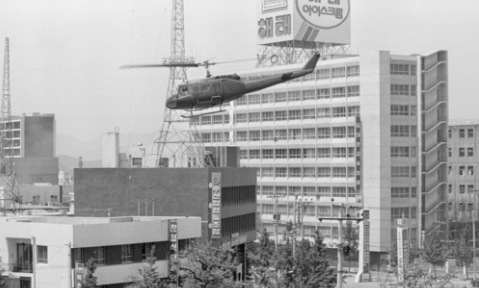 ▲ 1980년 5·18 민주화운동 당시 광주 동구 전일빌딩 주변에 헬기가 떠 있는 모습. (이미지 제공: 5·18기념재단) © 세계뉴스 |